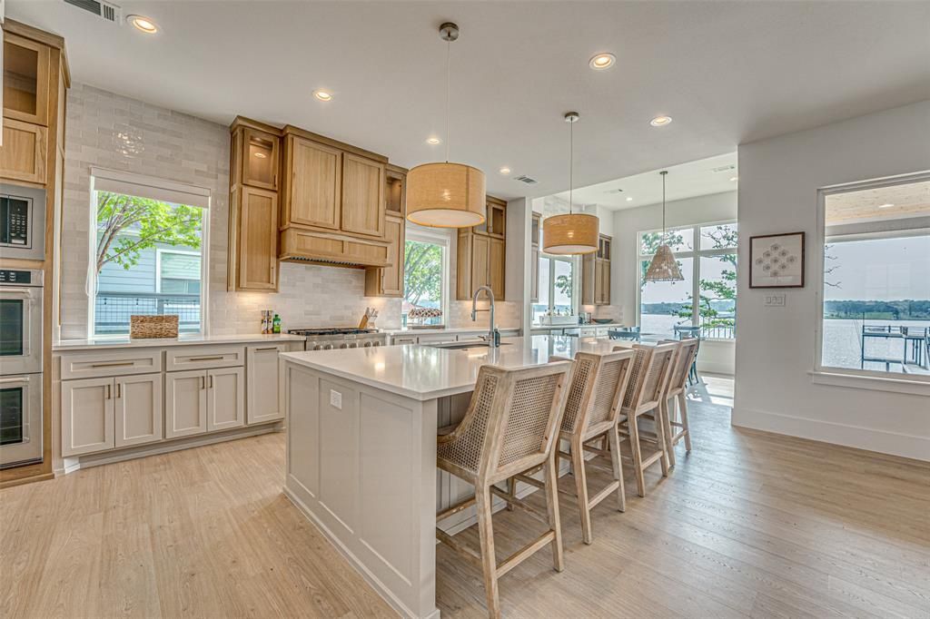 Luxury lakeside living in the highly sought-after, private gated community of Park Harbor on Cedar Creek Lake where short-term rentals are not permitted & breathtaking open-water views. Exquisite Cape Cod waterfront home w flexible floor plan w 2 primary suites, 2 guest suites, & oversized 2 car garage is energy efficient w spray foam encapsulated construction. Fully furnished w designer furnishings including TV's & upscale finishes are showcased throughout, w Mohawk RevWood white oak flooring, quartz countertops, Delta fixtures, & custom cabinetry. Chefs kitchen boasts white oak cabinetry, full suite of KitchenAid SS appliances w 6 burner gas cooktop, upper & lower cabinet lighting, & lg island w abundant seating. Dining is ideal for entertaining w a beverage center & bar service. Family room w floor-to-ceiling stone gas fireplace, white oak floating shelves, Levolor blackout roller shades, & dramatic wall of windows overlooking the expansive covered patio & open water. First primary suite located on the main level w serene water views, spacious WIC, dual vanities, seamless glass walk-in shower, & under-cabinet lighting. Guest suite w ensuite is also located down. Upstairs, the expansive gameroom features 16' of windows capturing panoramic lake views. Second primary w vaulted ceilings, stunning views, dual vanities, freestanding soaking tub, & seamless glass walk-in shower. Additional ensuite bedroom & dedicated office w custom built-in desk complete level 2. Oversized covered patio w gas stone fireplace, creating space for year-round enjoyment. Fully remodeled boat dock w composite decking, new lift motor, cables, cradle, & mooring whips ensures effortless lake life. Impressive courtyard retreat w 4 Japanese maples, prof. landscape lighting, pavers, turf, & framed lake views through the home, sheltered outdoor sanctuary offers protection from windy lake days while maintaining an elevated, resort-style ambiance. Enjoy the neighborhood fishing pond and boat ramp.
