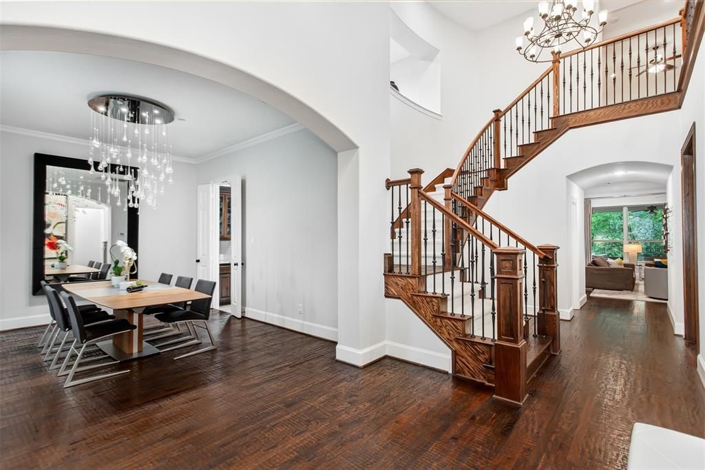 Elegant two-story 5-bedroom, 5.5-bathroom home with 5,018 square feet in Star Creek in Allen, Texas on a wooded creek-greenbelt lot. This Highland home features hardwood floors, updated LED lights-chandeliers, a curved staircase, and detailed moldings create a refined entrance. The formal dining room features an updated chandelier and connects to a secondary office-flex space with built-in knotty alder cabinetry & shelving. The private study includes a beamed ceiling, custom shelving, and an adjacent powder bath. A spacious living room anchors the open floor plan with wood ceiling beams, a floor-to-ceiling tiled fireplace, and windows overlooking the wooded backyard. The updated kitchen features expansive granite counters, a large island with separate bar seating, abundant knotty alder cabinetry with glass fronts, tile backsplash to the ceiling, and high-end appliances, flowing into a sunlit breakfast nook. Both the primary suite and guest suite are on the main floor. The guest suite offers an ensuite full bath with a walk-in shower. The primary suite features bay windows, granite dual vanities, a separate soaking tub and shower, and a large walk-in closet. The second level includes an extended game room with a built-in bar and a private balcony overlooking the wooded lot, a tiered media room with a passthrough window, and three secondary bedrooms, each with a full bath. Outdoor living features a covered patio with a fireplace overlooking a wooded greenbelt-creek lot, professional front and back landscaping, a putting green, and a 3-car front-entry garage. Star Creek amenities include 2 community pools, a playground, sports court, clubhouse, and walking-jogging trails. Zoned to Jenny Preston Elementary. Minutes from Watters Creek, the Villages of Allen-Fairview, Allen Premium Outlets, Target, Costco, Dick's, Bonefish Grill, and Cinemark. Refined luxury living in Star Creek, Allen, Texas.