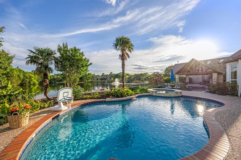 Nestled in the Willow Springs neighborhood of Heath, TX, this exceptional home offers breathtaking views of a private stocked pond. A grand two-story foyer with a sweeping curved staircase creates an impressive first impression. The thoughtfully designed main floor includes a private guest suite with a full bath, a powder bath, a versatile living room ideal for a study or music space, a formal dining room, kitchen, and family room. The dining room is a standout, featuring a cozy gas log fireplace and picturesque lake views through expansive windows. The kitchen is both stylish and functional, showcasing an electric glass cooktop, double convection ovens, a large farmhouse sink, quartz countertops, and marble backsplash. Casual dining is effortless with a spacious breakfast nook with built-in china hutch, and counter-height bar seating. The adjacent family room is warm and inviting, complete with built-in cabinetry, a stone gas-starter fireplace with raised hearth, a built-in desk which could double as a dry bar, and a striking double tray shiplap ceiling. The first-floor primary suite is a serene retreat with tray ceiling, and offering tranquil lake views through large bay windows. The ensuite bath features dual vanities, a freestanding soaking tub, separate shower with rainfall shower head, and a generous walk-in closet. Upstairs, you’ll find a game room that opens to a covered balcony, along with three additional bedrooms and two full baths, providing ample space for family and guests. Step outside to your own private oasis. The beautifully landscaped yard features a heated pool with spa and water feature, fire pit, and an expansive covered outdoor living area complete with a gas grill, beverage refrigerator, built-in ice chest, misters, and a fireplace—perfect for year-round entertaining. Home has been almost entirely remodeled including new roof, HVAC, water heater, windows, & carpet. This home is a true gem and a rare lot on the water in Heath, TX.
